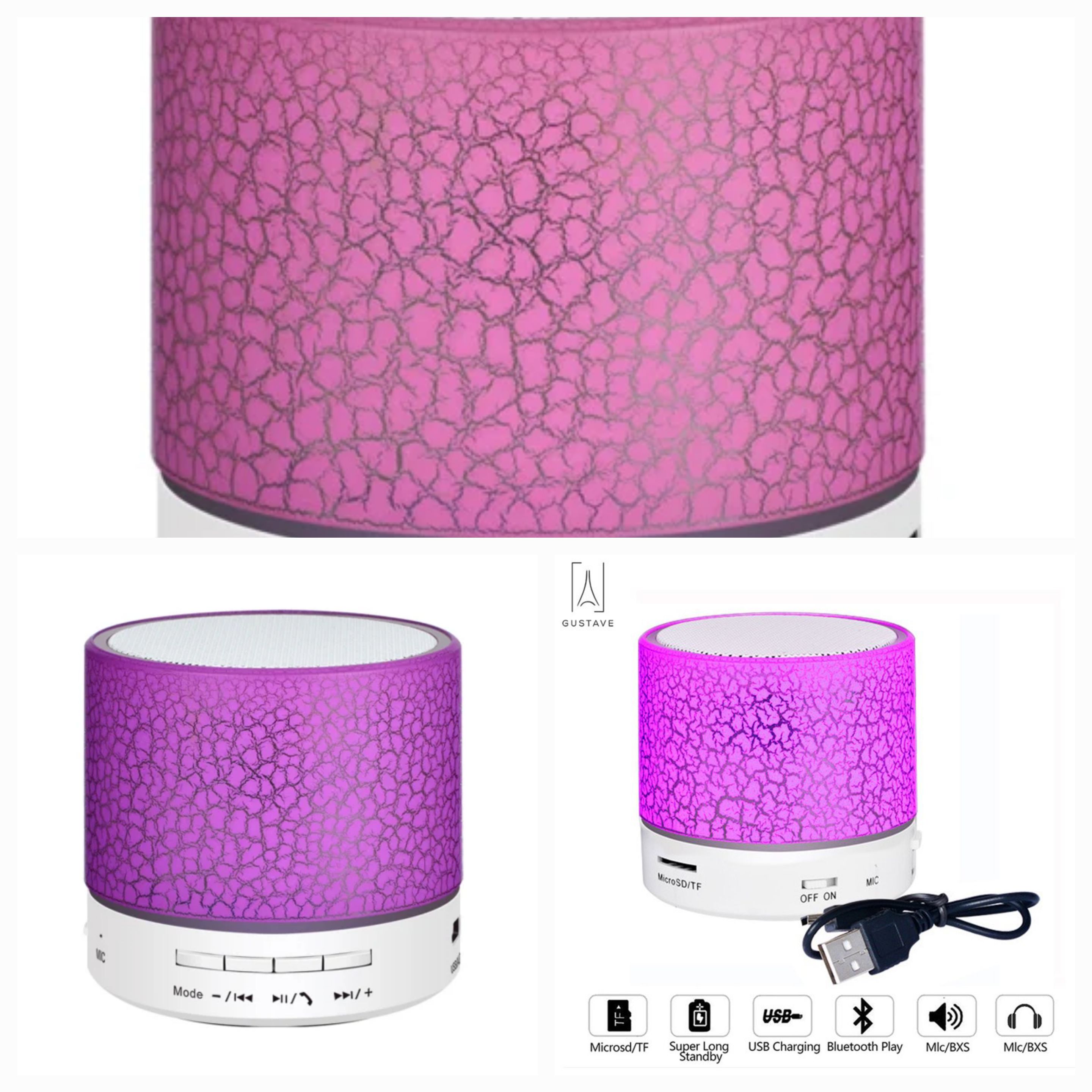 This compact Bluetooth speaker delivers high-quality sound with vibrant LED dancing lights. Supports Bluetooth, USB, TF card, and FM radio. Built-in 520mAh battery provides up to 2 hours of playtime. The ABS plastic and aluminum construction ensures durability. Perfect for parties, travel, or home use. Includes hands-free calling and auto voice prompts.